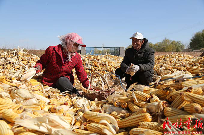 陳綠師老兩口忙著處理剛收的6萬(wàn)斤玉米(陳濤 攝影)