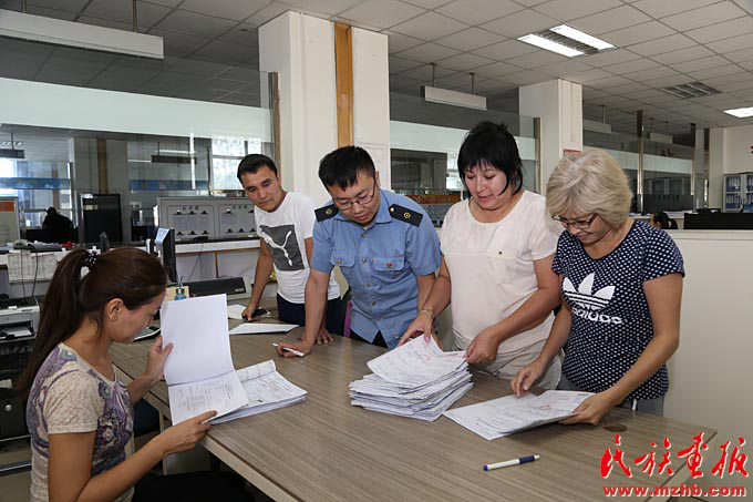 中哈兩國(guó)鐵路人員在阿拉山口口岸進(jìn)行貨物交接驗(yàn)收(滕俊 攝影)