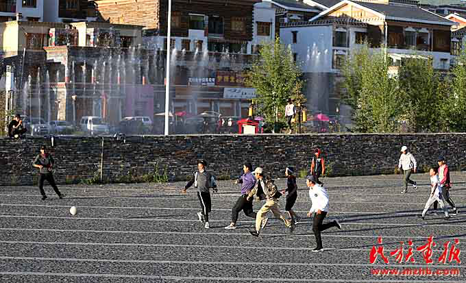 災(zāi)后重建讓玉樹大踏步前進(jìn),人們悠閑地走在廣場上享受著基礎(chǔ)設(shè)施改善帶來的各種便利
