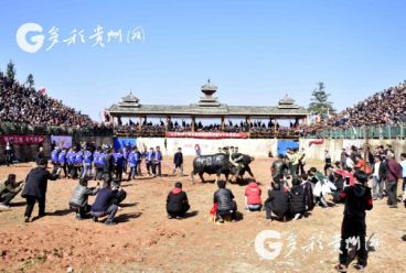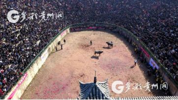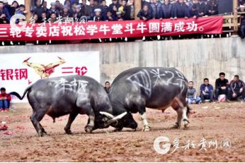 貴州省從江縣第十五屆原生態(tài)侗族大歌節(jié)的前一天,恰逢該縣逢亥斗牛日,丙妹鎮(zhèn)松學(xué)斗牛塘、谷坪鄉(xiāng)四寨河斗牛塘同時(shí)舉辦傳統(tǒng)牛王爭霸賽,喜迎一年一度“侗族大歌節(jié)”的到來,共有來自周邊村寨的80頭水牯牛參戰(zhàn),斗?;顒訄錾厦=侵?,場面異彩紛呈,吸引數(shù)萬名觀眾前來觀戰(zhàn)。
