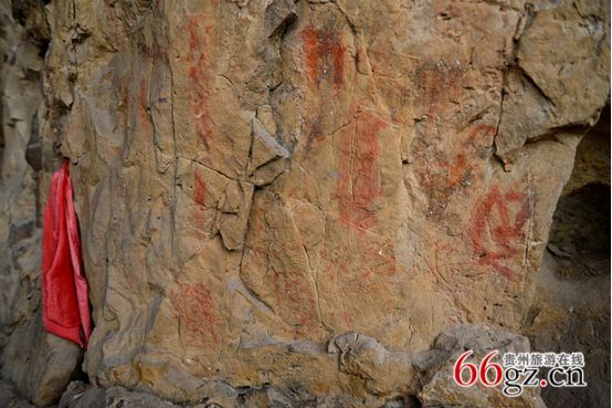 同時,在金山洞壁上的清代壁題也數量眾多,既有題詩,又有紀事,還有祝文,分別題于清乾隆、道光、咸豐年間。明顯可見“貴州貴陽府”和“貴陽府廣順州”等字樣。還有1949年以后的毛主席語錄,均以赭色書寫。據說時至今日,仍有村民在巖下洞口焚香秉燭,寄拜巖神,祈禱康健。現在在巖石上還能看到祈福的紅布和被煙火熏黑的巖洞。