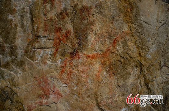 據資料載,金山洞古代崖畫以赭色涂繪人、馬、狗等等,隱約可見形態(tài)各異的大小圖像二三十個。人物多作行走狀,亦有雙手高舉者,似乎在祈禱。從其畫風觀察,與相距不遠的省級文物保護單位--長順龍家院崖畫十分相似。