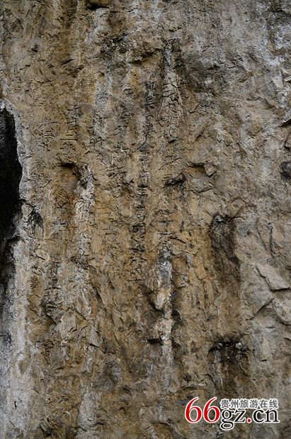 金山洞摩崖是貴陽市花溪區(qū)最早的摩崖石刻,也是貴州最早的摩崖石刻之一。該摩崖石刻位于燕樓鄉(xiāng)東北三里的金山洞巖壁上。其山上豐下儉,古人利用自然山形,在可避風雨的洞壁上摩巖、題刻賦詩作畫。整個摩崖面積通高140厘米,寬74厘米;自右至左豎行排列,共6行82字。據系楷書陰刻,書法古樸流暢,具有較高的歷史價值。