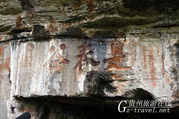“是春谷”摩崖長20米,高3米,約2萬余字,名為《洗心泉集》,從經(jīng)史集成的詩章共46首,670佘行。所集之書包括易、書、詩、春秋、三禮、四書、孝經(jīng)、爾雅、楚辭、漢、魏、晉、劉宋、南齊、北、周、隋、唐、五代、宋、金、遼、元、明以及時賢黔宦,黔人等各時代著名書籍。每字約4,5厘米見方,歐體楷書工整秀麗,為貴州摩崖上乘之作?!鞍灼r春流環(huán)谷水,青山高詠屬宣城?!庇紊酵嫠g,詠此詩句,別有韻味。