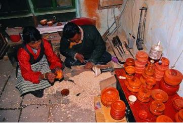 木碗的來源,一是西藏自己生產(chǎn)的,還有一種是云南迪慶生產(chǎn)的,都是從西藏的市場上交換或購買的。西藏林芝地區(qū)的朗縣、察隅,山南地區(qū)的加查、隆子、錯那,阿里地區(qū)的噶爾等地均產(chǎn)木碗。其中尤以錯那生產(chǎn)的“察牙”木碗和噶爾生產(chǎn)的“堆旭”木碗最負盛名。以上木碗的原料選擇樹根或樹瘤車制而成,選料之講究,做工之精細,使好木碗的花紋各異,或磷火紋,或豬鬃紋,或貓頭鷹眼紋,這些木碗都很名貴,與普通木碗之間的價格也很懸殊,一個上等木碗價值10頭牦牛,一般人家是不敢問津的,但也盡量想方設(shè)法弄個像樣的,以慰平生。