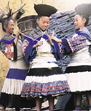 要論“疊穿”的數(shù)量之最,則當屬貴州大方縣顯母村的苗族女性了。與苗族慣用銀飾的固有印象不同,這里的苗族女性鮮以銀為飾,她們用數(shù)量極為可觀的服飾“疊穿”來彰顯富裕。節(jié)日里,顯母村的苗族女性換上盛裝——數(shù)條百褶裙系在腰間,塑造出豐腴的臀部造型,內(nèi)層裙子素凈無花,外層裙子則布滿條帶狀蠟染裝飾。在這個難得的大型社交場合,未婚女孩通過“疊穿”后的獨特造型來展示自己的魅力,衣物的數(shù)量和精致程度成為了吸引異性、獲得肯定的重要標準和獲得美好婚姻的重要條件。到了婚禮時,女性所著裙子的數(shù)量更是可達35條?;楹?,她們要在裙邊加上一圈深色邊飾以作標識。