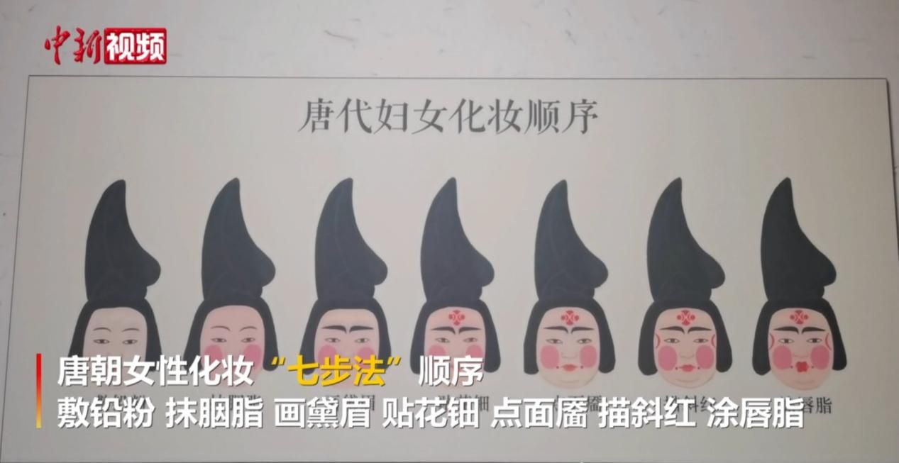 記者從展覽中的展板看到,唐朝女性化妝“七步法”順序:敷鉛粉、抹胭脂、畫黛眉、貼花鈿、點面靨、描斜紅、涂唇脂。