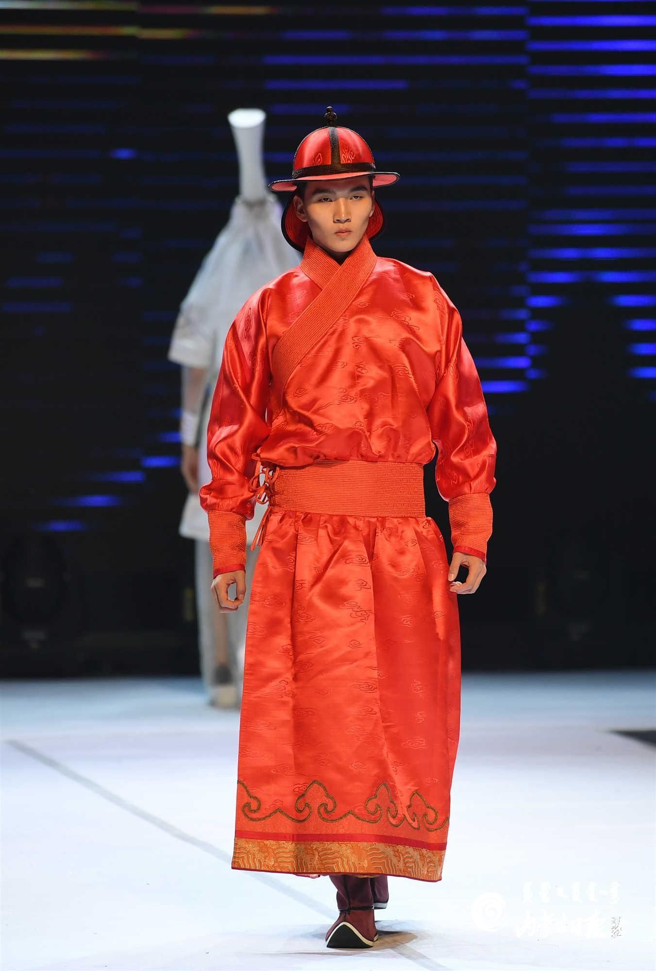 內(nèi)蒙古藝術(shù)學(xué)院的學(xué)生在舞臺(tái)上展示蒙古族禮服。