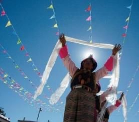 藏族自古崇尚白色,認(rèn)為白色是純潔、吉祥、誠(chéng)摯、善良、正義和繁榮的象征。藏族崇尚白色由來(lái)已久,先民們把羊毛掛在門楣和各種器皿上;山口、要道的嘛呢石堆上放白色石頭;插箭祭“拉則”(山神的居所)時(shí),在箭桿上系白色羊毛等等,無(wú)處不見白色崇拜的印記,藏族居住的青藏高原人們習(xí)慣稱做雪域,作為最常見的景物伴隨著民族漫長(zhǎng)的歷史,白色更自然地進(jìn)入藏民族的審美觀念中,滲入藏民族的靈魂深處。