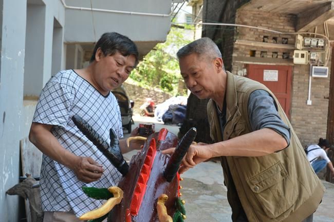 家住鎮(zhèn)遠(yuǎn)縣?陽(yáng)鎮(zhèn)東關(guān)社區(qū)的皇安東,今年68歲,雖然年近古稀,但精氣神堪比五十來(lái)歲的中年人,皇安東介紹由于個(gè)人愛(ài)好,8歲時(shí)與龍舟接下了深厚的情緣,對(duì)“龍”文化研究的執(zhí)著像一如往日對(duì)戀愛(ài)的投入充滿(mǎn)激情和憧憬一樣,經(jīng)過(guò)60多年的龍舟文化研究探索,他手工雕刻的龍頭威武靈動(dòng)融匯鎮(zhèn)遠(yuǎn)傳統(tǒng)文化精髓,“鎮(zhèn)遠(yuǎn)賽龍舟”已被列為國(guó)家非物質(zhì)文化遺產(chǎn)項(xiàng)目名錄?;拾矕|49歲開(kāi)始自學(xué)雕刻龍頭,鎮(zhèn)遠(yuǎn)端午節(jié)每年祭祀用的龍頭幾乎出自他手,雕刻的龍頭已上數(shù)百頭。當(dāng)筆者提到皇安東為何歷經(jīng)六十多年對(duì)雕龍頭的“手藝”癡心不改時(shí),他笑著爽朗地說(shuō):“我一生雕龍頭,主要的精神動(dòng)力是對(duì)鎮(zhèn)遠(yuǎn)傳統(tǒng)龍舟文化的熱愛(ài)和傳承?!被拾矕|一家人整天在“龍”的藝術(shù)空間里過(guò)得有滋有味。