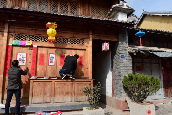 寫春聯(lián)繪年畫的傳統(tǒng)在劍川縣金華鎮(zhèn)由來已久,明朝洪武年間改土歸流和移民屯邊制度的推行,使儒家文化、理學(xué)思想逐漸融入邊疆人民的生活。金華古鎮(zhèn)居民受此影響,走上追求仕途功名的道路,文人鄉(xiāng)紳都以顯示儒學(xué)身份為榮。每逢春節(jié),人們會(huì)邀請有功名的仕子或傳學(xué)明經(jīng)的文人來到家中,撰寫對聯(lián),同時(shí)根據(jù)時(shí)令畫上一兩幅門神畫,希望通過此舉祈愿自家后生求得功名。如今走在金華古鎮(zhèn)西門街上,仍能看到家家種花養(yǎng)草,戶戶楹聯(lián)盈門,一派文風(fēng)蔚然的生機(jī)。