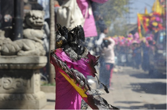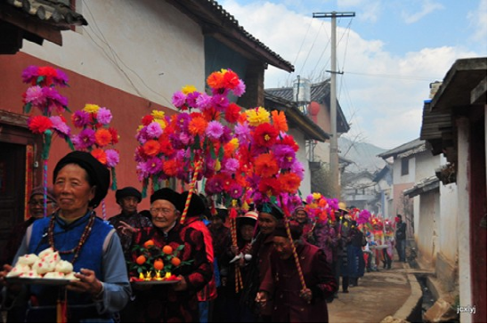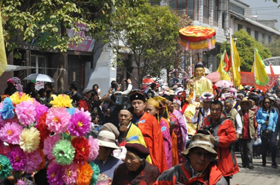 農(nóng)歷二月初六,迎太子入城。這一天在佛教徒的帶領(lǐng)下,人們焚香沐浴,衣冠整齊,虔誠地將“太子”(用布扎油漆制成的太子行像)請到行宮或本主廟里。這一年的新郎為太子抬轎,希望能得到太子的保佑而使新婚的妻子孕生男兒。