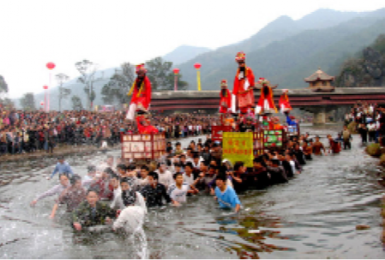 第二次是農(nóng)歷正月十五日上午,分上、下半闕。上半闕仍依十四日走法,至過(guò)午一時(shí)許,古事列隊(duì)從“方龍橋”下河床。鼓樂(lè)隊(duì)先互相潑水透濕,然后三響神銃,古事棚蜂擁下水,逆水而走。除天宮一棚不能超越外,后棚超前棚,則視為吉利。于是抬夫拼力而為,爭(zhēng)先恐后,不顧天寒水深、河石苔滑,跌倒了再爬起,情緒異常高昂,至下午三時(shí)許,一年一度的走古事才在高潮中落下帷幕。