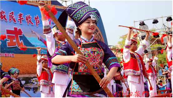 都安瑤族自治縣群眾打起扁擔,歡慶“中國農(nóng)民豐收節(jié)”。