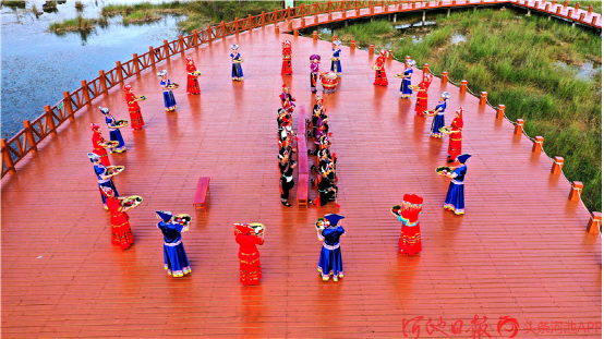 都安各族群眾在澄江國家濕地公園表演打扁擔。