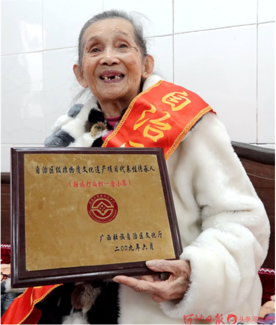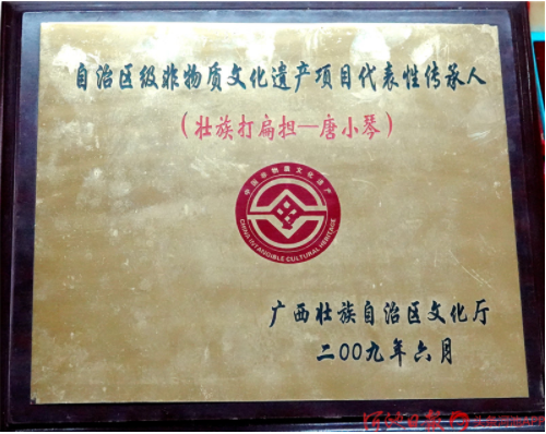 今年已經(jīng)88歲高齡的“壯族打扁擔”技藝傳承人唐小琴,她從小即耳濡目染,跟村里老人、長者學(xué)習(xí)打扁擔,后因打扁擔需要指揮,又學(xué)習(xí)皮鼓打法。1961年4月,唐小琴從學(xué)校調(diào)入縣文化館任文化藝術(shù)輔導(dǎo)員,挖掘整理了《壯族打扁擔》《板凳舞》《斑鳩舞》等一大批傳統(tǒng)舞蹈,并多次在自治區(qū)、河池地區(qū)的比賽、調(diào)演上獲獎。1986年退休后,仍然致力于《壯族打扁擔》的傳承工作,2004年,組建都安縣老干康樂藝術(shù)團,帶動安陽鎮(zhèn)退休老人學(xué)習(xí)打扁擔技藝。2009年,她被確認為自治區(qū)非物質(zhì)文物遺產(chǎn)項目“壯族打扁擔”代表性傳承人。