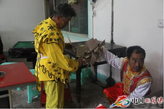 高臺(tái)是用5至7張八仙桌一層層疊壘,最上面的桌子四腿朝天,總高度近8米。四人登臺(tái)表演。兩個(gè)人扮獅子,把獅頭獅皮披在身上,只露雙腳;另外兩人分別裝扮成孫悟空和笑臉和尚揮舞手帕,大蒲扇逗引獅子逐層攀上高臺(tái),為了穩(wěn)固,安全起見,每張桌子的四角都用草紙疊浸水后墊著防滑,做到萬(wàn)無(wú)一失。
