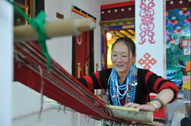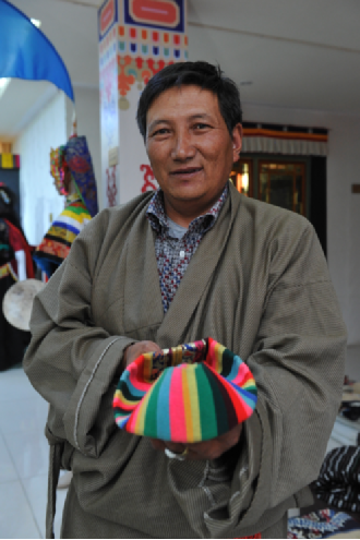 在自治區(qū)群藝館的展出現(xiàn)場(chǎng),除卻這些光鮮亮麗的民族服裝之外,另一個(gè)特殊群體也同樣吸引了眾人的目光,他們便是從西藏各個(gè)地區(qū)前來(lái)為觀眾展示藏裝制作工藝的民間手工藝人。他們有的在織布,有的在裁剪,有的在穿針引線做靴子、縫制衣服,這些數(shù)以萬(wàn)計(jì)的、平凡而又偉大的民間手工藝人們,用他們幾十年如一日的堅(jiān)守,默默地承擔(dān)著民族文化創(chuàng)新與傳承的歷史使命。