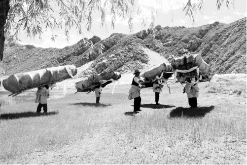 據(jù)悉,每次表演舞蹈時(shí),“阿熱”只能唱二、三首歌,唱久了因船夫們負(fù)重太多堅(jiān)持不了很長(zhǎng)時(shí)間??“汀肮巍钡捻懧暫芴貏e:船夫們舉雙手把船扶住,一支船槳從船夫的腰背上穿過,與背上的木質(zhì)滑輪撞擊后發(fā)出響聲。這響聲在一般跳“果諧”舞中感受不到,它有一種人與自然頑強(qiáng)抗?fàn)幍膫€(gè)性特點(diǎn)。阿熱”的基本舞步均取之于當(dāng)?shù)亍肮C”,具有靈活多變,頓地為節(jié)的特點(diǎn),而船夫們的“顫膝擺”等姿態(tài),更具有“高原之舟”—— —牦牛的特性。整個(gè)舞蹈既輕盈又凝重,別有一番情趣。