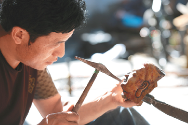 20歲前的次嘎已可以承接一些佛像的鍛敲任務(wù),掌握的技術(shù)遠(yuǎn)遠(yuǎn)超出一起學(xué)習(xí)的其他學(xué)徒們。從鍛敲佛像的蓮花底座、焊接,再到鍛敲銅佛造像上半身、下半身,再到慢慢地開始做些佛像飾物。偶爾,次嘎也能涉獵造像的臉部。這是一個(gè)造像師手藝達(dá)到最好時(shí)才可以觸及的部位?!懊娌拷Y(jié)構(gòu)復(fù)雜又微妙,面部表情的刻畫更是難上加難。作為一個(gè)造像師,這是最考驗(yàn)功力的地方,每一次敲打都在決定作品的成敗?!贝胃抡f道。