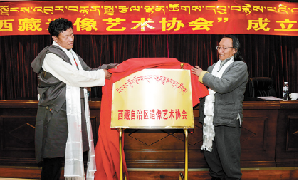 2017年12月3日,西藏造像藝術(shù)協(xié)會(huì)在拉薩成立。 圖為該協(xié)會(huì)會(huì)長朵普·次嘎(左)與西藏民族藝術(shù)研究所副所長阿旺丹增共同為協(xié)會(huì)揭牌。