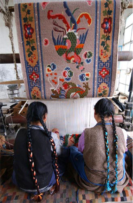 從前,“措巴”每年都要派人去拉薩專為達(dá)賴?yán)锖偷胤秸幙椏▔|以及其他羊毛織品。十三世達(dá)賴?yán)锿恋羌未霑r期,江孜織工索朗多布杰手藝高超,曾為達(dá)賴?yán)锟椓穗p龍靠墊、凈水瓶袋等著名織品,被封為五品官。民主改革后,江孜卡墊業(yè)在中央政府的關(guān)懷下又有了新的發(fā)展,他們編織的“布達(dá)拉宮”、“珠穆朗瑪”、“萬里長城”等壁毯和地毯,是享譽(yù)國內(nèi)外的精品。