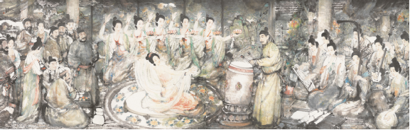 劍器舞也有著悠久傳統(tǒng),早在春秋戰(zhàn)國時(shí)代,孔子的學(xué)生子路,戎裝見孔子,曾拔劍起舞。學(xué)生拜見老師舞劍,當(dāng)然只是表演技藝,是對老師致敬的意思。湖北隨縣戰(zhàn)國初期曾侯乙墓出土的鴛鴦盒上的樂舞圖案中,鼓旁的舞者腰間掛著短劍,說明劍舞可能是當(dāng)時(shí)頗為流行的一種舞蹈形式。楚漢相爭時(shí),劉邦、項(xiàng)羽宴于鴻門,項(xiàng)莊說:“君王與沛公飲,軍中無以為樂,請以劍舞?!表?xiàng)羽表示同意,于是項(xiàng)莊拔劍起舞,逐漸靠近劉邦,企圖借機(jī)殺死劉邦,在場的項(xiàng)伯見劉邦危急,也以劍伴舞,保護(hù)劉邦不被項(xiàng)莊殺害。這個(gè)故事表明,當(dāng)時(shí)筵宴中有舞劍作為助興表演的風(fēng)俗。唐代,杜甫作《故武衛(wèi)將軍挽歌三首》,有“舞劍過人絕”句。可見當(dāng)時(shí)許多人會(huì)舞劍,而且各有絕招。公孫大娘最為擅長的《劍器舞》,是《裴將軍滿堂勢》。杜甫曾觀其舞,并寫了《觀公孫大娘弟子舞劍器行》一詩,觀者如山,可見此舞技巧之高。