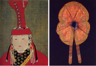 【圖為察必皇后(罟罟冠)與元代金絲(納石失)披肩,編者搜集】