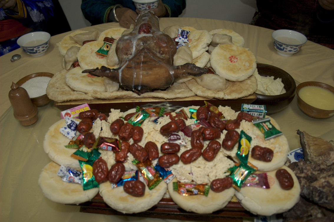 全羊席,又稱整羊席(蒙古語為“布禾勒”或“酥斯”),是蒙古人招待貴賓的傳統(tǒng)佳肴,也是蒙古民族最古老、最隆重的一道宴席,一般只在盛大宴會、隆重集會、舉行婚禮或接待高級貴賓時擺設(shè)。將整羊加工后擺在長方形的大木盤里,像一只臥著的羊,肉味鮮美,香飄滿堂。賓客在進餐前,還要舉行一定的儀式,高唱贊歌,朗誦獻整羊祝詞等。據(jù)文獻記載,成吉思汗曾設(shè)過全羊宴。忽必烈登基時,也設(shè)全羊宴祭神祇、待賓客。至清代全羊宴更加盛行,現(xiàn)已成為蒙古民族風(fēng)格接待貴賓的名貴菜肴,馳名中外。