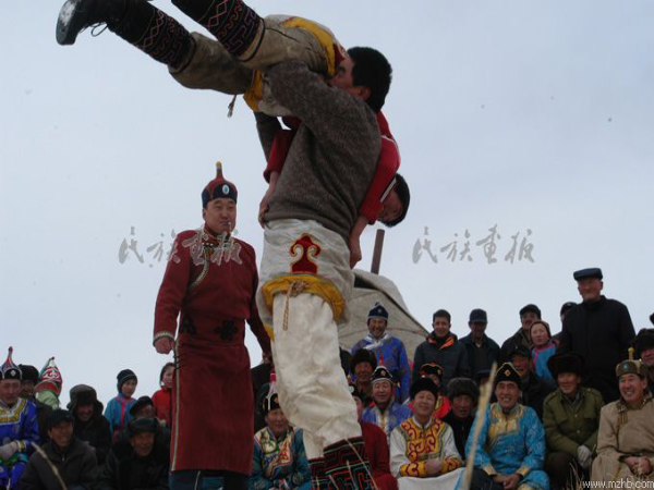 春節(jié),蒙古人稱為“白節(jié)”、“大年”,是蒙古人傳統(tǒng)節(jié)日,時(shí)間在農(nóng)歷正月初一。居住在農(nóng)村、城市、工礦區(qū)的蒙古族過春節(jié)的習(xí)俗同漢族差不多,但牧區(qū)有許多不同的特點(diǎn)。除夕之夜為“守歲”,合家老小席地坐在蒙古包中的矮桌周圍,桌上擺著一盤盤香噴噴的肉類、奶食品,以及糖果、香煙、美酒等物,有的還要在矮桌上供一張大紙,紙上寫著祖先的名字。午夜,開始飲酒吃年飯,或吃除夕餃子。按規(guī)矩團(tuán)圓之宴要多吃多喝酒、肉,食器要擺滿滿一席。如吃不完也要剩得越多越好,象征新的一年里吃喝不盡、年年有余。家里的年輕人,要向長(zhǎng)者敬“辭歲酒”。特別有意思的是全家共吃一塊由酥油、糖、白面烙成的大圓餅,這叫吃新年餅,每人只吃一口,意思是全家永不分離,永久團(tuán)圓,永遠(yuǎn)過甜甜蜜蜜的日子。除夕之夜要耍“嘎拉木”(玩羊骨頭)、說書、唱歌、跳舞,通宵達(dá)旦,熱鬧一宿。過大年,按習(xí)慣還要拜年,大年三十晚上為辭舊歲禮, 初一早上為迎新年,晚輩給父母和老人叩頭、敬酒、獻(xiàn)哈達(dá),祝老人們身體健康,晚年幸福!老人擁抱孩子們,并斟上一碗鮮奶,祝愿子女們幸福,像牛奶一樣純潔。大年初一早餐后,男女盛裝,三五成群來到浩特(村鎮(zhèn)),挨家串戶給親友拜年??腿诉M(jìn)屋首先向長(zhǎng)輩叩頭拜年,祝愿老人身體健康,年豐人壽。按習(xí)慣由主人家的女婿向客人逐個(gè)敬酒,每敬必喝,或邊喝邊唱,邊唱邊舞。