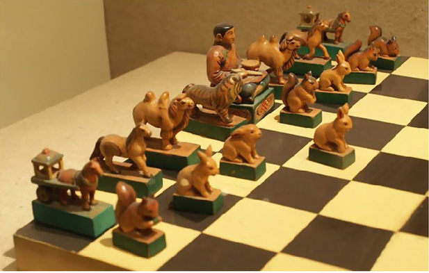 蒙古象棋棋盤,淺色的叫白格,深色的叫黑格,棋子也分白黑兩種,共32個,雙方各有一王、一帥、雙車、雙象、雙馬和八個小兵。與國際象棋不同的是,蒙古象棋把象刻成了駱駝,把兵刻成了獵狗的形象,增添了草原游牧生活特色。在民間,玩蒙古象棋仍然是古波斯的走法,也就是國際象棋原來的走法。但明朝永樂年間的《芝仙集》有關蒙古象棋的記載表明,現(xiàn)代蒙古象棋的走法早在14世紀末就已定型。這比現(xiàn)代國際象棋的定型要早100多年。