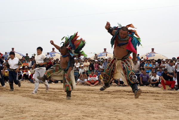 賽馬、射箭、摔跤(搏克),作為蒙古民族傳統(tǒng)的“男兒三藝”,自古就是草原男子漢們的拿手本領。這些活動不需要專門的場地、特殊的器材和固定的人數(shù),隨時隨地都可進行。因此,“男兒三藝”不僅是那達慕大會的主要賽事項目,放牧之余或婚禮、節(jié)慶時刻,也經(jīng)常開展此類民間體育活動。另外,蒙古民族傳統(tǒng)體育項目尚有馬術表演、賽駱駝(此項另文介紹)和蒙古象棋比賽等。