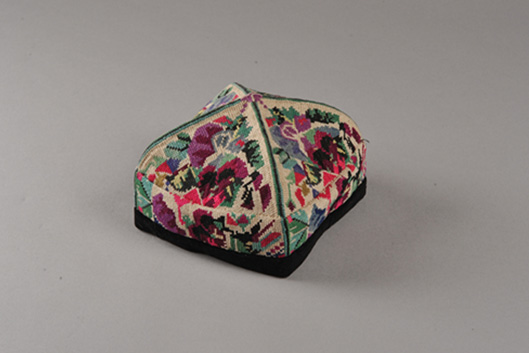“曼甫朵帕”此款花帽是由手工刺繡成的,四瓣以帽頂為中心拼接縫合,套模成型,以黑絨鑲邊,四棱可折疊。每一瓣三角形內(nèi)以一個(gè)或兩個(gè)單獨(dú)紋樣,一條邊緣紋樣構(gòu)成一組適合紋樣,這種紋樣簡練、構(gòu)圖嚴(yán)謹(jǐn)?shù)幕眻D案稱為單獨(dú)適合紋樣花帽,維吾爾語稱“曼甫朵帕”。此花帽紋樣大都是以新疆花卉、果實(shí)等自然形態(tài)為素材,加以藝術(shù)的提煉、概括、夸張、變化而使之成為具有濃郁鄉(xiāng)土氣息和強(qiáng)烈民族情趣,圖案有花卉、果實(shí),造型有石榴花、桃花、杏花、麥穗,還有星月、雪花等。此外還大量運(yùn)用了富有變化的幾何圖案。布底為一色平線,圖案則用優(yōu)質(zhì)彩色絲線混合棉線刺繡而成,形成底色和花色對比強(qiáng)烈,艷麗奪目。