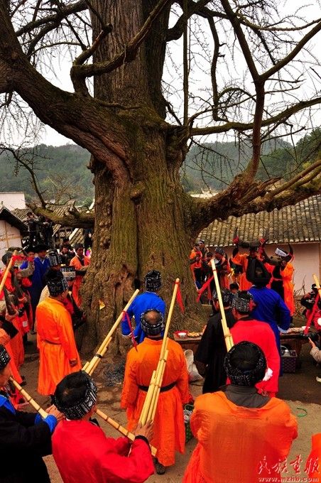 苗族寨老引領(lǐng)眾人來(lái)到寨中央的千年銀杏樹(shù)下進(jìn)行祭樹(shù),寨老高舉牛角、男人們吹起蘆笙圍著古樹(shù)轉(zhuǎn)圈,司儀唱起“古歌”祈禱。寧堅(jiān)攝影,引自民族畫(huà)報(bào)