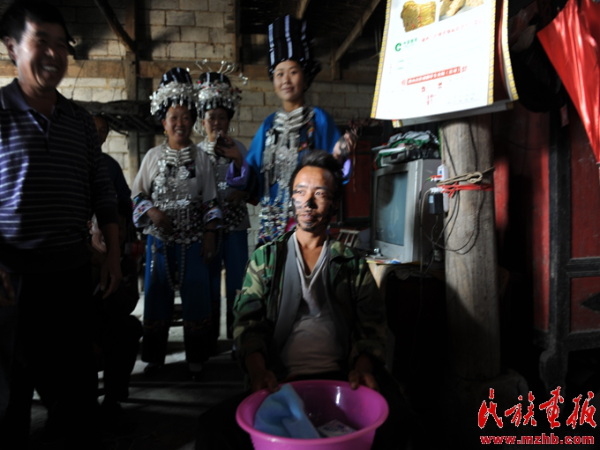 姑娘出嫁必須有娘家人陪送,婚禮這一天清早,“新娘”便在“接親客”的帶領(lǐng)和送親隊(duì)伍的陪同下,一路歡聲笑語(yǔ) ,浩浩蕩蕩向“新郎”家走來(lái)。走到新郎家村邊,有的燃放鞭炮,一直燃放到新郎家門(mén)口,請(qǐng)新郎父母出來(lái)開(kāi)門(mén);無(wú)鞭炮準(zhǔn)備的,則在寨邊稍候,由迎親伙伴飛報(bào)新郎家做好迎親的準(zhǔn)備。男方父母聽(tīng)到后,多數(shù)是很高興地喊醒家中兒女,由新郎的妹妹或堂姐妹為迎親主體,加上寨上的姐妹和房族組成迎親隊(duì)伍,打開(kāi)大門(mén),把新娘迎進(jìn)家來(lái)。接親的主要儀式是接傘。接傘的人必須是新郎的小妹或堂妹。無(wú)親妹、堂妹者則由新郎父母指定一與新郎同輩份的小姑娘去接。新娘走至大門(mén),即由新郎的妹妹跨出門(mén)外迎接新嫂子,新嫂子接著用左手把雨傘遞給接傘的妹妹,接傘妹妹接過(guò)新嫂子手中的雨傘后,新娘即用左腳跨進(jìn)屋內(nèi),以示今后成為新家庭的主婦。隨即由接傘妹妹攜新娘手迎入新房,迎親婦女們陸續(xù)進(jìn)入新房休息。入門(mén)后,新郎家的“陪娘”及姑娘們便熱情地安排“送親客”團(tuán)團(tuán)圍坐,并簇?fù)碇靶履铩本o靠堂屋中柱子就坐,意為“新娘”從此當(dāng)家立業(yè),將來(lái)就像中柱子一樣,頂大梁,撐起這個(gè)家。