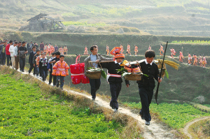 貴州省丹寨縣排調(diào)鎮(zhèn)苗族青年結婚,婚禮簡單淳樸,形式別具一格。女孩子出嫁視家庭條件陪送谷子或糯米,家庭...