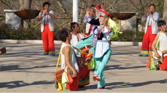 大三弦舞又叫“阿細(xì)跳月”,流傳于云南撒尼和阿細(xì)民間的一種舞蹈。據(jù)傳大三弦舞來源于刀耕火種時(shí)代。跳這種舞時(shí),男子一字排開,彈著三弦或吹著笛子跳。隨著節(jié)奏抬腳踢腿,向前退后、向左向右交換舞步。女青年亦一字排開,腿上的動作與男青年一致。不同的是女青年要拍手,原地跳一段節(jié)奏,由左向右轉(zhuǎn)一個圈,輪回反復(fù)。有時(shí)男子向前沖,女子向后退,富有情趣。