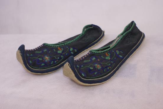 壯族花鞋是壯族的刺繡工藝之一,又稱“繡鞋”,為婦女所用,流行于廣西龍州等地。鞋頭有鉤,象龍船。分有后跟和無(wú)后跟兩種。鞋底較厚。針?lè)ㄓ旋R針、拖針、混針、盤(pán)針、堆繡、壓繡等。在色彩上,年輕人喜用亮底起白花,常用石榴紅、深紅、青黃、綠等艷麗色,紋樣有龍鳳、雙獅滾球、蝶花、雀等;老年人多用黑色、淺紅、深紅等厚色,紋樣有云、龍、天地、獅獸等。