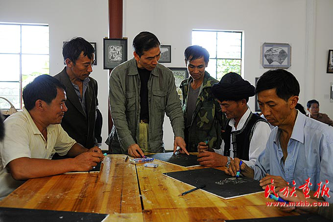 為了提升作品質(zhì)量,阿峨新寨村的版畫創(chuàng)作者邀請(qǐng)專家對(duì)其進(jìn)行藝術(shù)指導(dǎo)