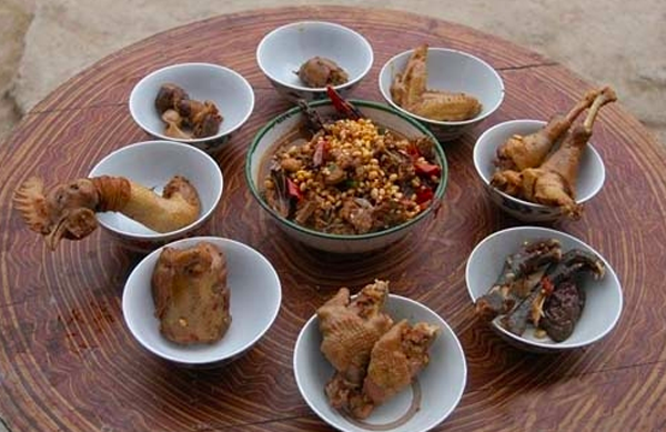 “頭”:第一種說法是頭給主人,稱之為“頭不出外”;第二種說法是給客人,表示尊敬;第三種說法是布依族青年男女訂婚時(shí),吃頭的人要把雞腦先剝?nèi)〕鰜斫o大家看,稱之為“吃雞還雞”(因?yàn)橐粋€(gè)完整的雞腦就活像一只小雞娃),“卦”兩只,原則上是主、客人各一只,稱之為主客平等,表示友好往來。布依族辦紅白喜事或是過年時(shí),都要看“卦”,測算辦的喜事是否吉祥,來年五谷豐登,六畜興旺等,稱之為“吃雞看卦”。看“卦”的內(nèi)容多,道理也比較深?yuàn)W。其余部位按對(duì)象依次分配,它的解釋也較多,吃“雞八塊”時(shí)最為講究的有兩點(diǎn):一是須由主人分配,得“頭”的人號(hào)召后,方能開席。二是對(duì)好“卦”、吉祥“卦”,主人都將其放在自家神堂上。以示四季平安,吉祥如意。