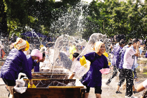 “扁水”是當(dāng)?shù)胤窖裕瑸閼蛩?、潑水之意?!氨馑笨駳g節(jié)源于侗族“為也”習(xí)俗,為做客之意,指村寨之間村民們的互相訪問(wèn),是當(dāng)?shù)匾?guī)模最大的社交和娛樂(lè)活動(dòng)?!盀橐病睍r(shí),當(dāng)?shù)囟弊迦罕姂蛩?、潑水狂歡,久而久之就形成了“扁水”狂歡節(jié)。