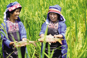 稻田養(yǎng)魚是當?shù)囟编l(xiāng)群眾的傳統(tǒng)習俗,燒魚是侗族的一種傳統(tǒng)美食?!盁~節(jié)”是當?shù)囟弊宓囊豁梻鹘y(tǒng)民俗活動。在初秋時節(jié),當?shù)囟弊迦罕婇_田放水,捉魚,全寨男女老少,野外生起篝火烤魚,用燒魚、米酒等祭祀魚神,祈禱魚糧豐收。圖為該寨的侗族群眾在稻田捕魚。