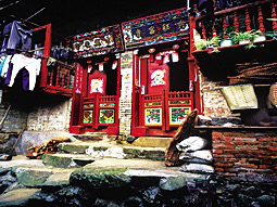 狹長(zhǎng)式的房屋大都建在深山里幾十戶大小的村寨。面闊一間并開正門,室內(nèi)隔間向縱深排列,從正門到后門有7道門之多。正門是大門也是第一道門,是家族的門面,被視為招財(cái)進(jìn)寶和迎接貴客之門。對(duì)開門扇高大厚實(shí),門檻上又設(shè)兩扇雕刻彩繪的矮門,天熱開大門通風(fēng)時(shí),可以防止禽畜入戶。大門兩側(cè)掛有木刻大字對(duì)聯(lián),大門墻面的屋檐下則畫有七彩畫卷。