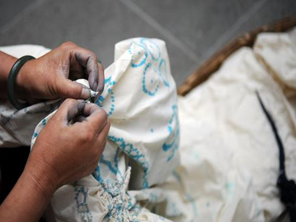 扎染布料為純白布或棉麻混紡白布。工藝過程分設計、上稿、扎縫、浸染、拆線、漂洗、整檢等工序。制作時,根據(jù)人們喜歡的花樣紋式,用線將白布縛著,做成一定襞折的小紋,再浸入染缸里浸染。染色時,將白布上畫好花紋的部分用針線縫起來,外觀上看,像一個個的疙瘩,入染缸中浸染,扎起的疙瘩不會著色,展開后即形成花紋。由于花紋的邊界受到染液的浸潤,圖案產生自然暈紋,青里帶翠,凝重素雅,薄如煙霧,輕芳蟬翅,若隱若現(xiàn)。