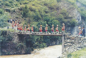 節(jié)日一大早,各家各戶便到供奉藥仙的樹林中,環(huán)藥仙的化身——一堆奇石或一棵古樹歌舞、供祭。隨后,人們各自相約成組,背籃荷鋤,唱著《采藥歌》,游山采藥。若遇到要采、挖的植物,小組中年歲最長(zhǎng)的人,會(huì)在其根部先挖一鋤,然后停鋤唱起《盤歌》:這是一兜草,它叫什么草?用它治啥???藥功好不好?隨之,挖藥者便從小到大,一人回唱一句作答:草名金錢草,采來(lái)加工變成寶,味苦、性涼用處多,肝病、尿阻少不了……之后,方采挖這棵藥草。
