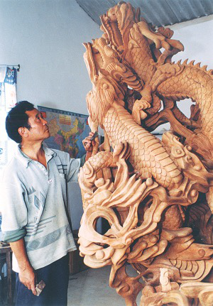 今年54歲的李元生,以雕龍而遠(yuǎn)近聞名。早在上個(gè)世紀(jì)80年代初,他創(chuàng)作的第一件根(木)雕作品《困龍也有上天時(shí)》,便被一位游客購(gòu)買收藏。在近20年的時(shí)間里,一些常人眼里只能當(dāng)柴燒的樹根,在他獨(dú)特的構(gòu)思和飛舞的刻刀中,變成了上百件大小不一的富有生命力的根(木)雕作品。其中的代表作有:《九龍傳說》、《送子觀音》、《長(zhǎng)壽九千年》、《金龍獻(xiàn)寶》、《哪吒鬧海》、《1999——人與自然》等。這些作品,不少被省內(nèi)外的單位和個(gè)人作為珍品收藏。