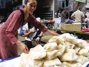 每天清晨,云南西雙版納傣族自治州景洪市嘎灑鎮(zhèn)集貿(mào)市場(chǎng)賣(mài)泡牛皮的傣族老咪濤(傣語(yǔ)意為“老阿媽”),都要忙得不亦樂(lè)乎。前來(lái)購(gòu)買(mǎi)泡牛皮的餐廳老板絡(luò)繹不絕。因?yàn)榇黾遗菖Fど钍苋藗兊南矏?ài),近年來(lái),隨著“傣家樂(lè)”餐廳如雨后春筍般崛起,賣(mài)泡牛皮的老咪濤生意越來(lái)越好。