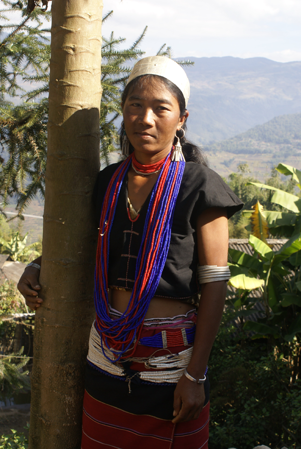 而婦女們的裝束特點(diǎn)分明與眾不同。最突出的是頭戴寬約3公分左右的銀箍,留長(zhǎng)發(fā);身著靛青色無(wú)領(lǐng)大襟右衽及橫條花筒裙。腰系紅布寬腰帶和數(shù)十根細(xì)藤圈。耳掛垂肩圓形大耳環(huán),頸戴銀質(zhì)大項(xiàng)圈,細(xì)項(xiàng)鏈。上了年紀(jì)的人,喜歡戴長(zhǎng)約五公分傘狀大耳筒,筒頂還刻有各種花紋。有的婦女在耳筒內(nèi)插上香花香草,有的放上人民幣,出門(mén)趕集,隨用隨取,很是便利(上下兩圖由劉軍供圖)。