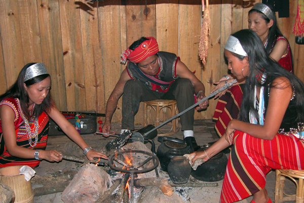 佤族普遍喜飲酒,喝苦茶。所飲用的酒都是自家釀制的“泡水酒”。常飲泡水酒不但于身體無害,反而有益健康。飲水酒成為佤族日常生活中主要的嗜好之一。喝酒時(shí)必須要請(qǐng)親友來家中共飲,主人給客人敬酒有一套規(guī)矩:必須一一敬酒。敬酒時(shí),雙手捧竹酒筒,走到客人面前,弓身把酒筒從自己胸前按下再向上舉到客人嘴邊,主人喝一口,最后敬給客人喝干。如此一一敬酒,直至敬完所有在場(chǎng)的人,漏敬一個(gè),都會(huì)被認(rèn)為是不合“阿佤理”的。敬酒時(shí),第一個(gè)被敬酒的人,通常是在場(chǎng)的客人中最被尊重的人。他接過酒后,先要用右手沾出幾滴,滴在地上,并口念祝福的語言,表示敬主人的祖先(圖為用竹筒制水酒,劉軍攝)。