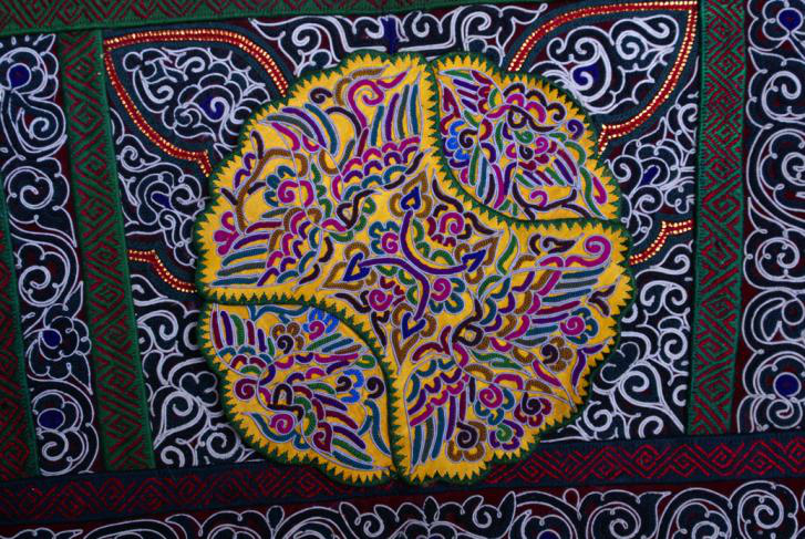水族有養(yǎng)馬賽馬習(xí)俗,馬尾繡應(yīng)運(yùn)而生。以絲線裹馬尾刺繡制作圖案的好處是馬尾質(zhì)地較硬,能使圖案不易變形,馬尾不易腐敗變質(zhì),經(jīng)久耐用;還有馬尾上含有油脂成分,利于保養(yǎng)外圍絲線光澤;另一奇特之處就是繡品上綴有形如古代錢幣的銅飾,以紅線穿貼于馬尾繡片里,如星星點(diǎn)點(diǎn)的小花,除了做裝飾外,水族同胞認(rèn)為,銅有驅(qū)邪避兇的功能。在封建社會,銅是鑄幣之物,一些朝代嚴(yán)禁民間鑄銅,馬尾繡里卻繡有銅飾,這充分體現(xiàn)了水族馬尾繡的珍貴文化藝術(shù)價(jià)值。